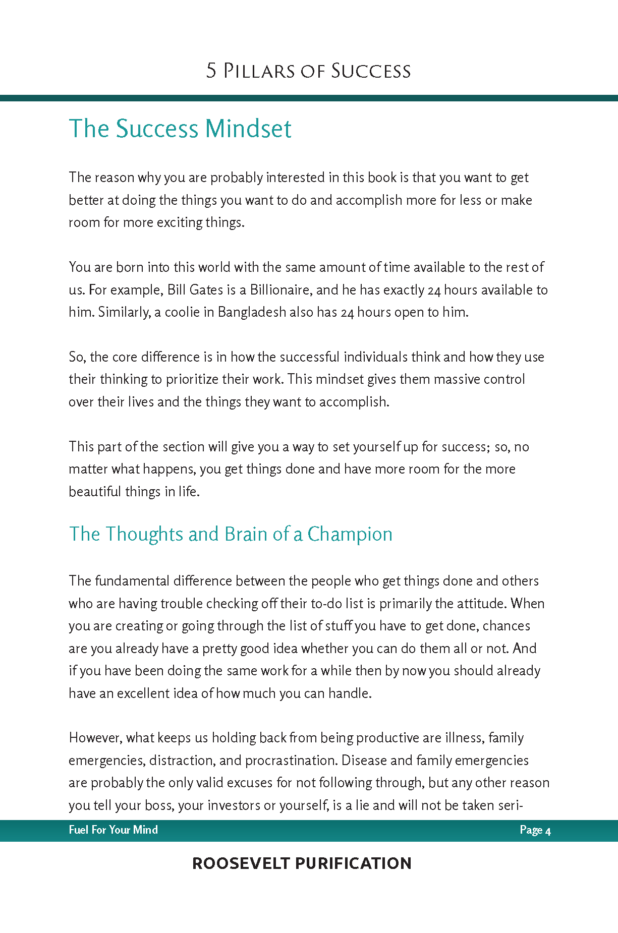 5 Pillars of Success is a self-help book that focuses on five critical areas of life. They are the conscious mind, ability to take massive action, ability to double one's productivity, ability to manage goals and the ability to take care of one's health. In each area, the author shares his knowledge and wisdom from his personal experience and also the knowledge he acquired after researching the most successful people around him. Each of his findings aims to help cultivate a bright future and help people become more successful in all areas of their life.