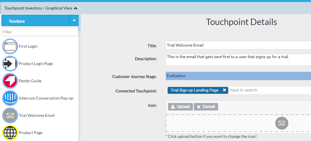- Touchpoint Inventory Software: gather up all your touchpoints digitally and make them available for drag-and-drop onto different maps. Add details, configurations, connections and more.