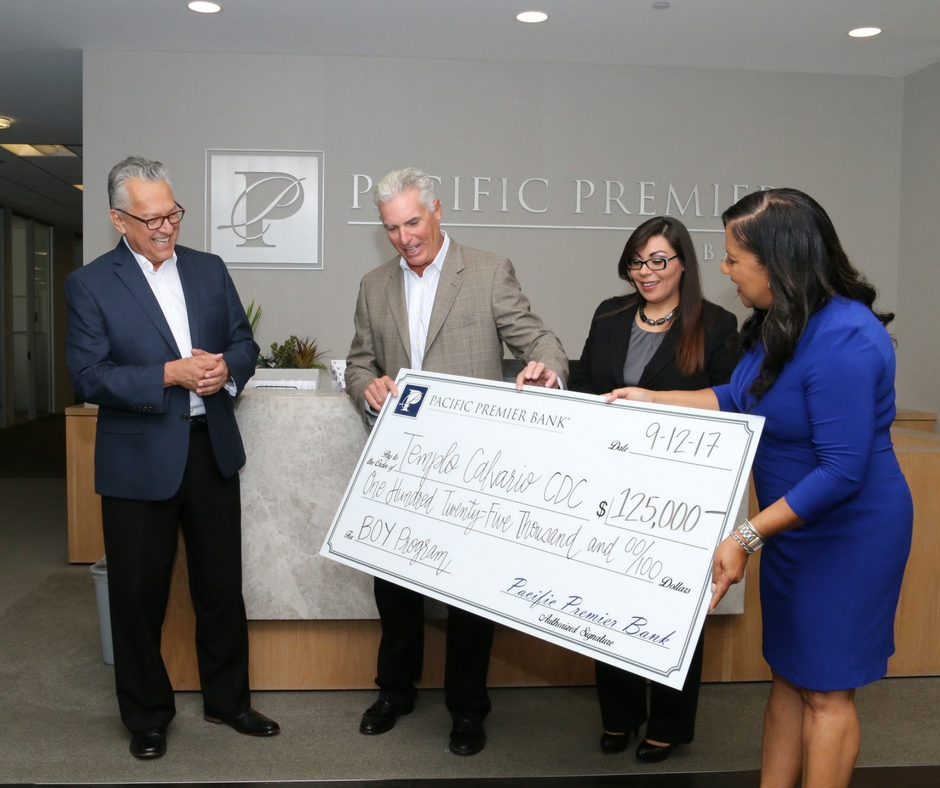 SANTA ANA, Calif., Sept. 21, 2017 /PRNewswire/ -- With gratitude, Templo Calvario Community Development Corporation announced that Pacific Premier Bank has made a major gift of $125,000 in benefit of their Banking On Our Youth Financial Literacy and Entrepreneurship Program. The check presentation took place on Sept. 12, 2017, at the Pacific Premier headquarters in Irvine, California. Pacific Premier's Chairman and Chief Executive Officer, Steven R. Gardner, personally presented the check to Templo Calvario's President and Chief Executive Officer, Lee de León, and Executive Director of Development, Yanet Gonzalez. The Banking On Our Youth Financial Literacy and Entrepreneurship program is an innovative, high-energy, deep impact approach to educating and giving high school students the opportunity to become financially capable young adults.