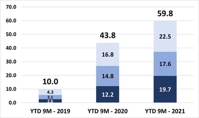 Revenues in the first nine months of 2021 grew to 59.8 million, a 37% increase over the same period of last year
