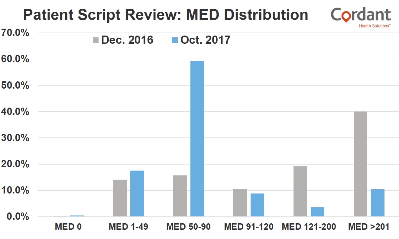 Referenced in the chart, in December of 2016, when Mimms' patients first started using Cordant, almost sixty percent were at 121 MEDs or above, with 40 percent of his patients over 201 MEDs. By October 2017 almost 60 percent of Mimms' patients were between 50 and 90 MEDs and only 15 percent had MEDs higher than 201.