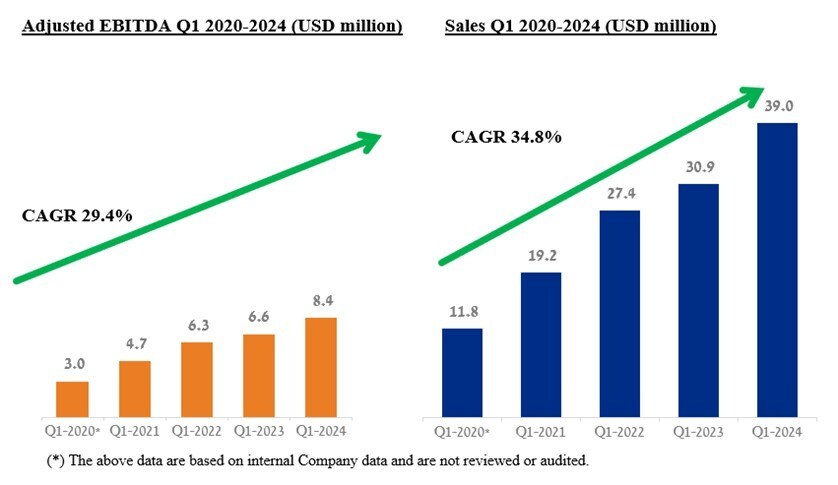 The operating profit amounted to 5.5 million dollars in the first quarter of 2024, a growth of 31.1% compared to 4.2 million dollars in the corresponding quarter last year. The increase and improvement in the operating profit is due to an increase in sales and efficiency measures and synergies.