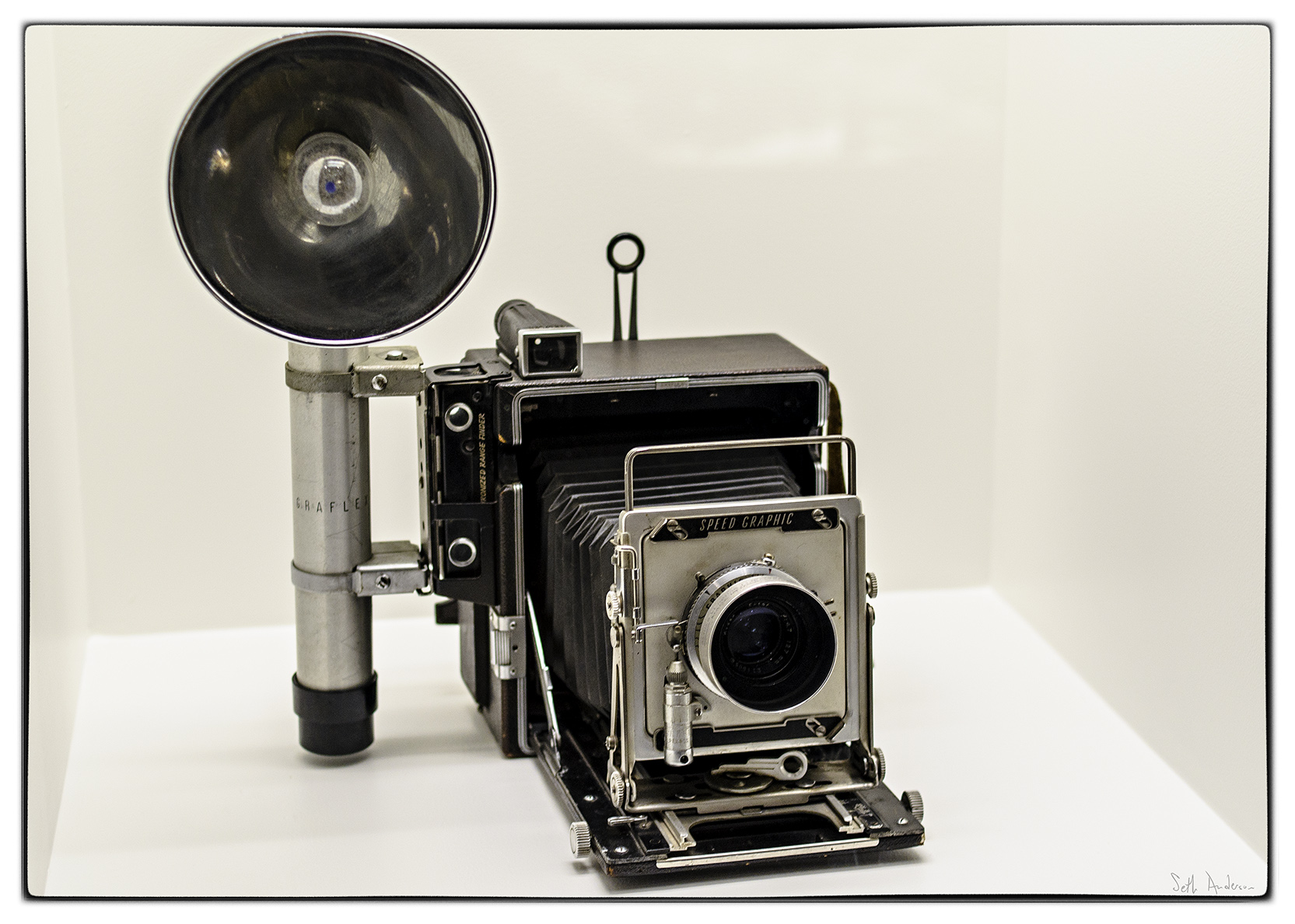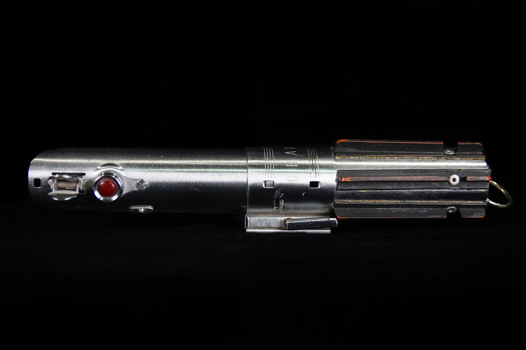 Believe it or not, this lightsaber was constructed from a vintage 1930s Graflex camera flash gun. The handle still has the original Graflex logo etched into it. It comes from the archives of Gary Kurtz, the producer on the first two Star Wars films.