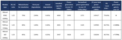 Abu Dhabi en Oriente Medio es elegido como un ejemplo típico para el escenario de aplicación a alta temperatura, que se ubica cerca de 24,4 °N con una temperatura media anual de 28,5 °C y una radiación horizontal total de 2.015,1 KWh/m2. La central eléctrica se diseñó con una relación CC/CA de 1,05 y una capacidad instalada de 4 MW (con pequeñas variaciones en el diseño real), con un ángulo de inclinación óptimo para el soporte fijo e inversores de cadena adecuados. Para el año 25, la ganancia de generación de energía de TOPCon es del 4,52 % y la ganancia de generación de energía de HJT es aún mayor, del 9,67 %, en comparación con la de PERC, como se muestra en la Tabla 3.2.