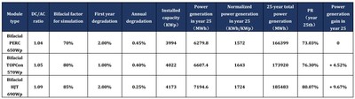 Con base en las características de los módulos, la brecha de generación de energía entre las diferentes tecnologías de celdas en cada región del mapa obedece principalmente a tres factores: coeficiente de temperatura, factor bifacial y degradación de potencia, por lo que los módulos HJT pueden ofrecer mayores ganancias de generación de energía y una producción de energía más estable para el sistema fotovoltaico gracias a su coeficiente de temperatura extremadamente estable, mayor factor bifacial y más retención de energía.