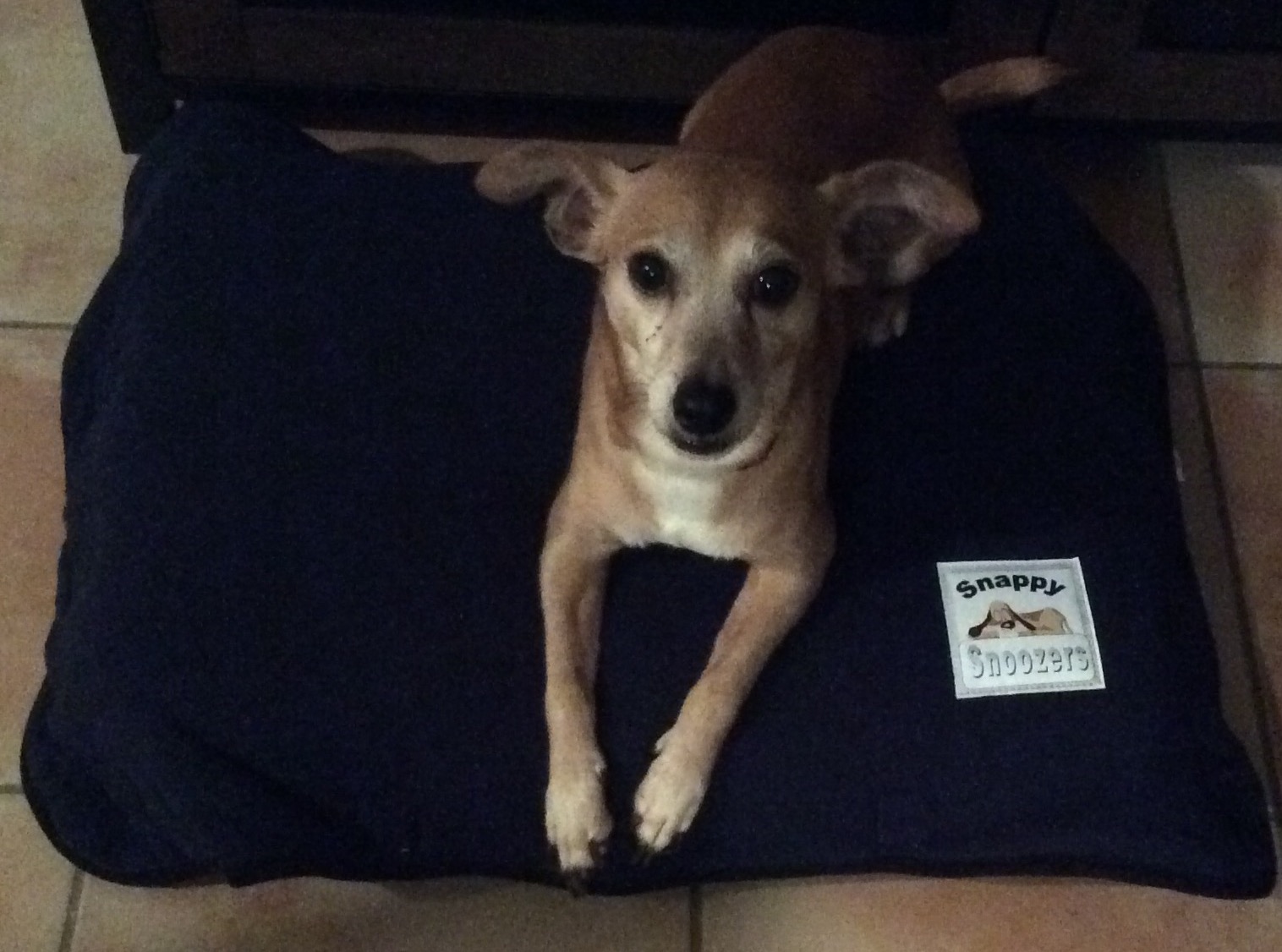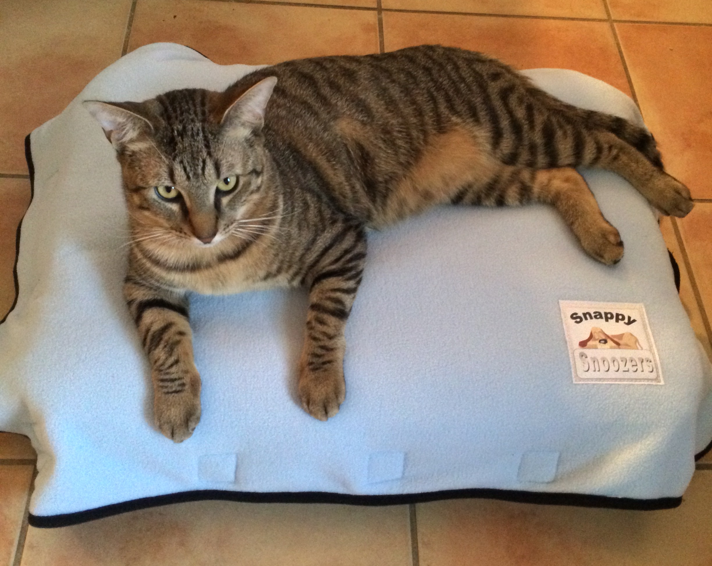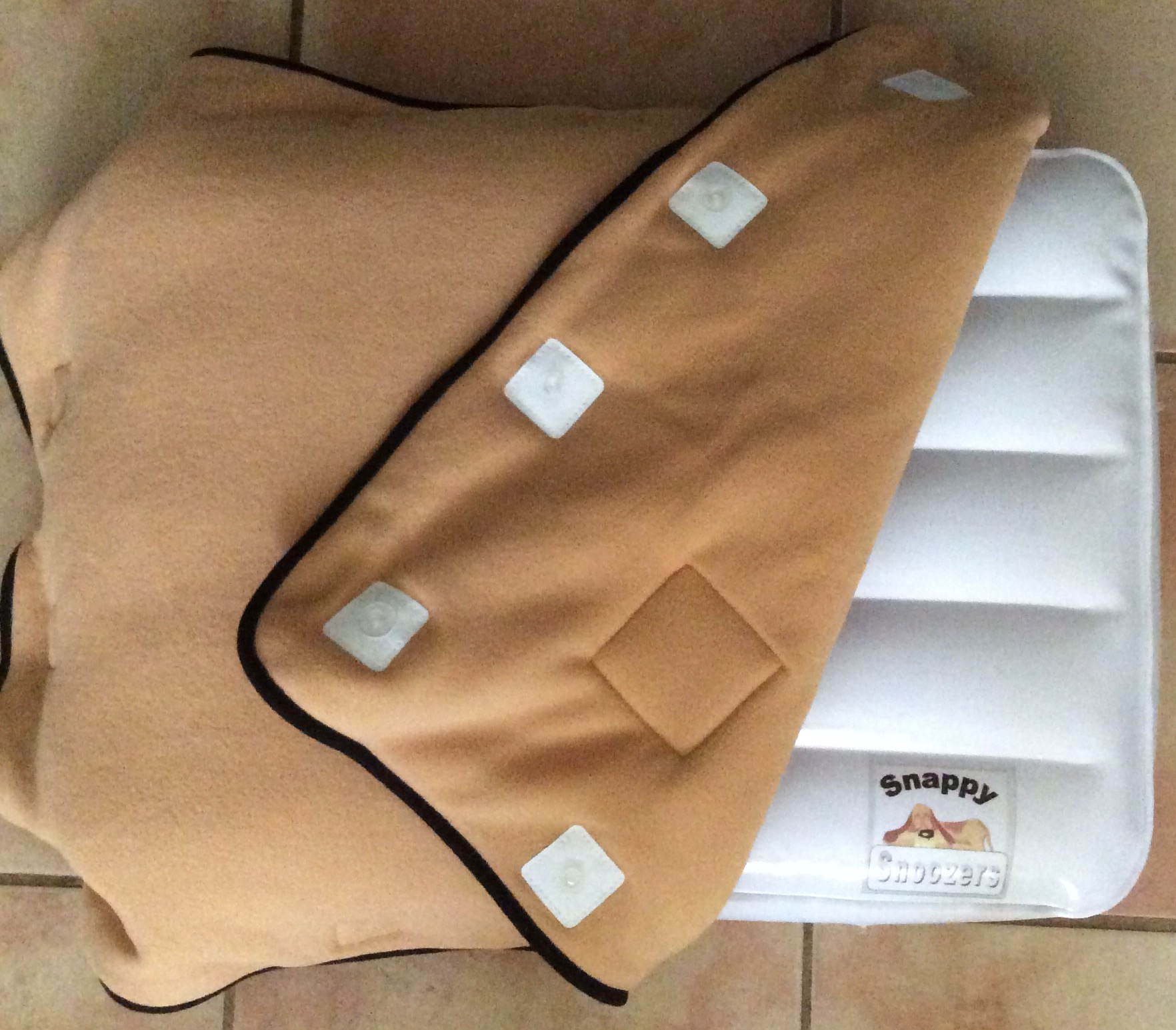 Snappy Snoozers is an inflatable mattress made with PVC, what makes this bed so unique, are the snaps along the sides of the mattress. The snaps allow you to easily to attach and detach a quilt on top of the mattress. Snappy Snoozers are considered orthopedic and are designed to evenly distribute the air within the air chambers of the mattress; this purpose alleviates the pressure off the joints in older arthritic pets. This pet bed was designed to make cleaning and sanitizing a breeze, especially for pets that suffer from incontinence issues. This unique pet bed can be used indoors, outdoors, its waterproof and makes a great travel bed, especially, when it's packaging is a travel tote. Snappy Snoozers is the pet's version of a Bed-In-A-Bag. It's an all-in-one and comes with a mattress, two replacement quilts, and an air pump packaged in a lovely travel tote.