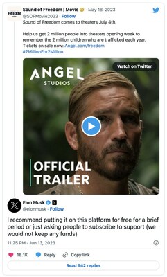 “El hombre más rico del mundo está usando su influencia para luchar por la libertad de los niños. Elon fue el primer Embajador de la Libertad, usando su plataforma para promover la misión de la película de rescatar niños y abolir la esclavitud infantil”, dijo el productor Eduardo Verástegui. Haga clic aquí para ver el comentario de Musk en la página de "Sonido de Libertad" en Twitter (ahora X).
