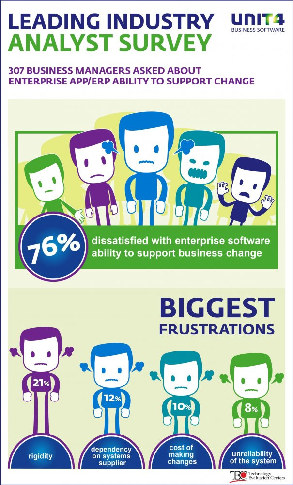 UNIT4 Business Software's parent company UNIT4, the world's leading provider of business software for Businesses Living IN Change (BLINC™), today announced the first findings of a new international research project undertaken by Technology Evaluation Centers (TEC) which surveyed 307 business managers and professionals from a range of industries about their ERP and enterprise applications' ability to support business change.