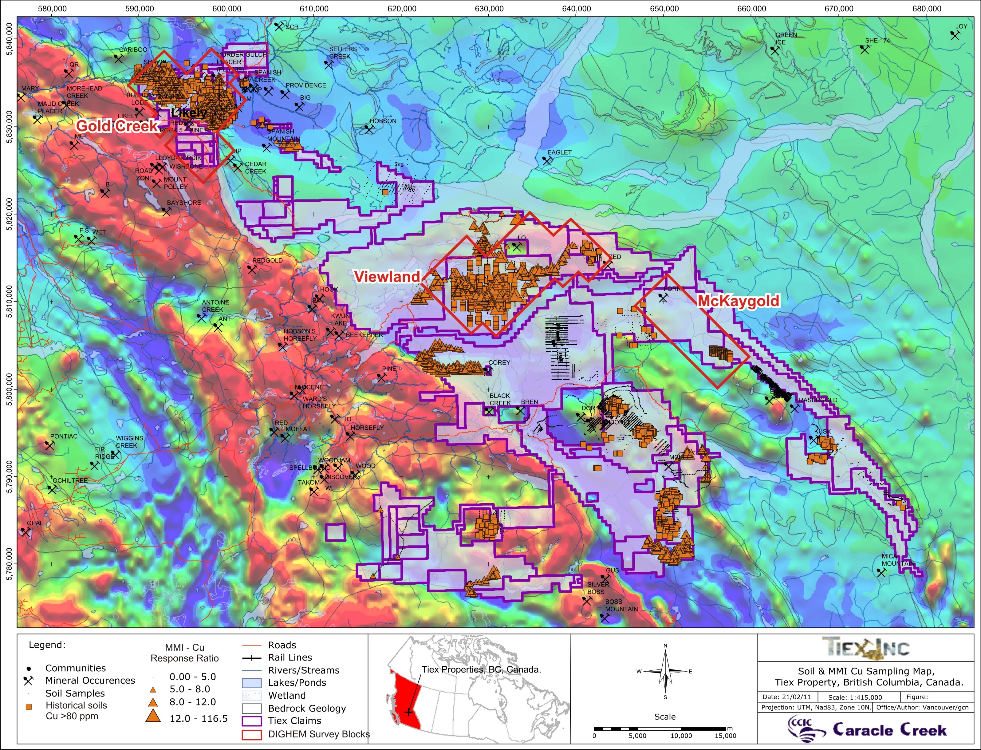 This airborne survey is currently underway and consists of three main block of mineral tenures in the Gold Creek, Viewland and McKaygold areas within the sedimentary hosted gold and the Viewland porphyry copper-gold project areas of the Company's land package, (please click this link (http://files.newswire.ca/936/TIEX_Au_soil_map.JPG) to view the gold planning map of the survey, click on this link (http://files.newswire.ca/936/TIEX_Cu_soil_map.JPG) to view the copper planning map of the survey). These planning maps show the evaluation of the historical conventional geochemistry and mobile metal ion (MMI) geochemistry as well as the proposed airborne flight path. As stated by the Company Geoscientist, Stephen Wetherup, "the MMI does confirm the old conventional geochemistry and gives the Company the ability to more accurately select drill targets for its drill programs".