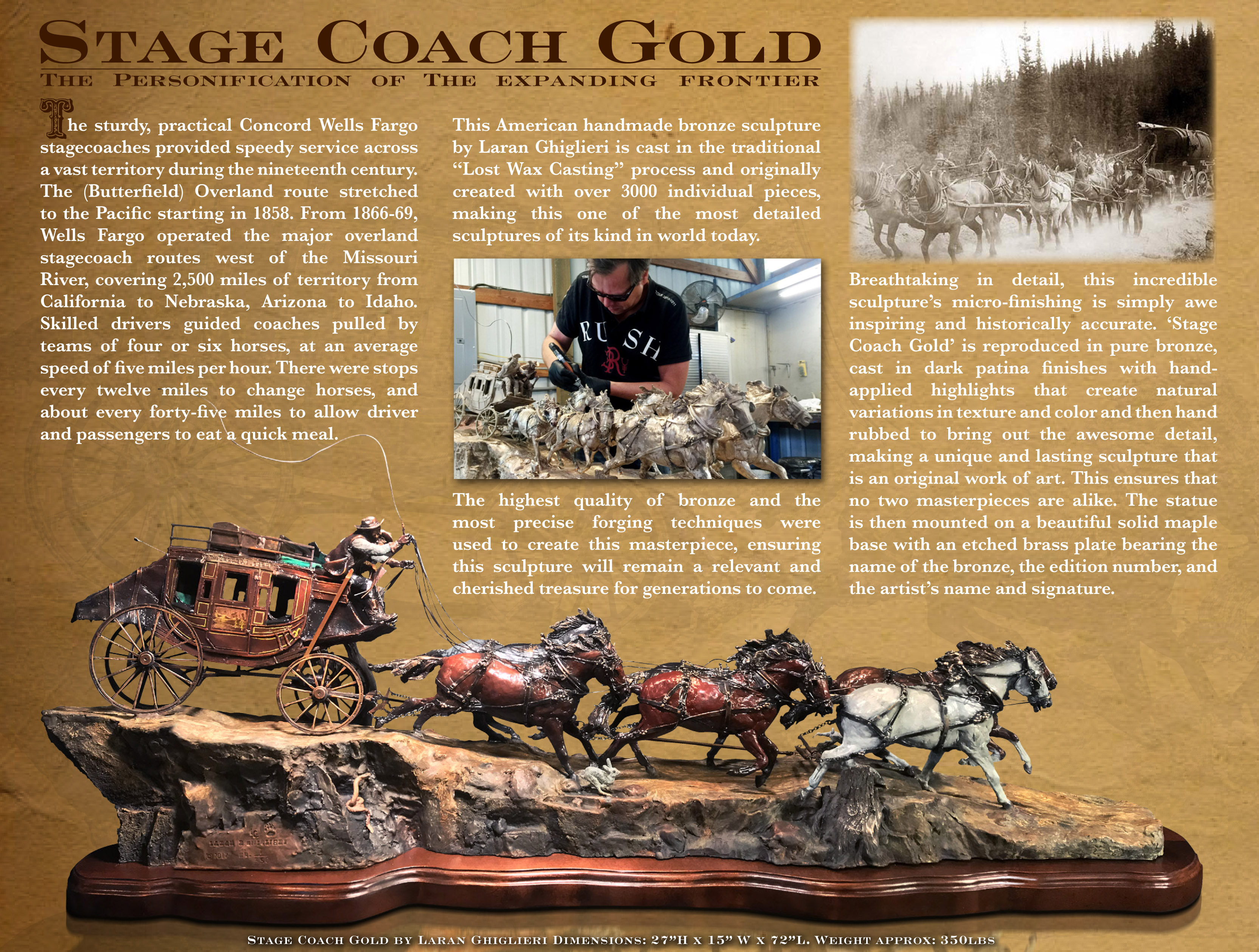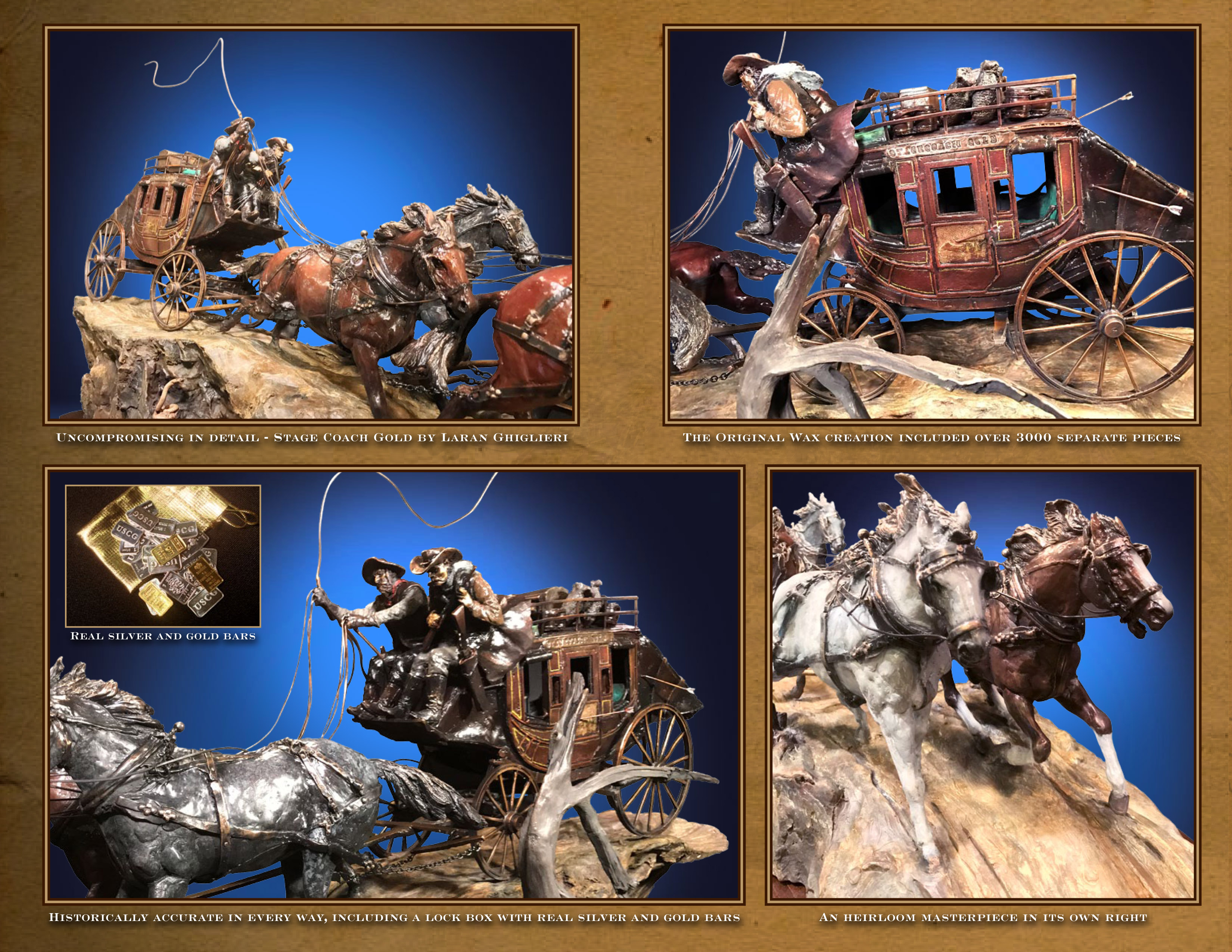 LAKE OSWEGO, Ore., Sept. 28, 2017 /PRNewswire/ -- Mark Russo, CEO of Treasure Investments Corporation commissions world-famous Laran R. Ghiglieri to create a historically accurate 1860 concord stage coach to be cast in bronze, pure silver and solid gold. This American handmade bronze sculpture by Laran Ghiglieri is cast in the traditional "Lost Wax Casting" process and originally created with over 3,000 individual pieces, making this one of the most detailed sculptures of its kind in the world today.