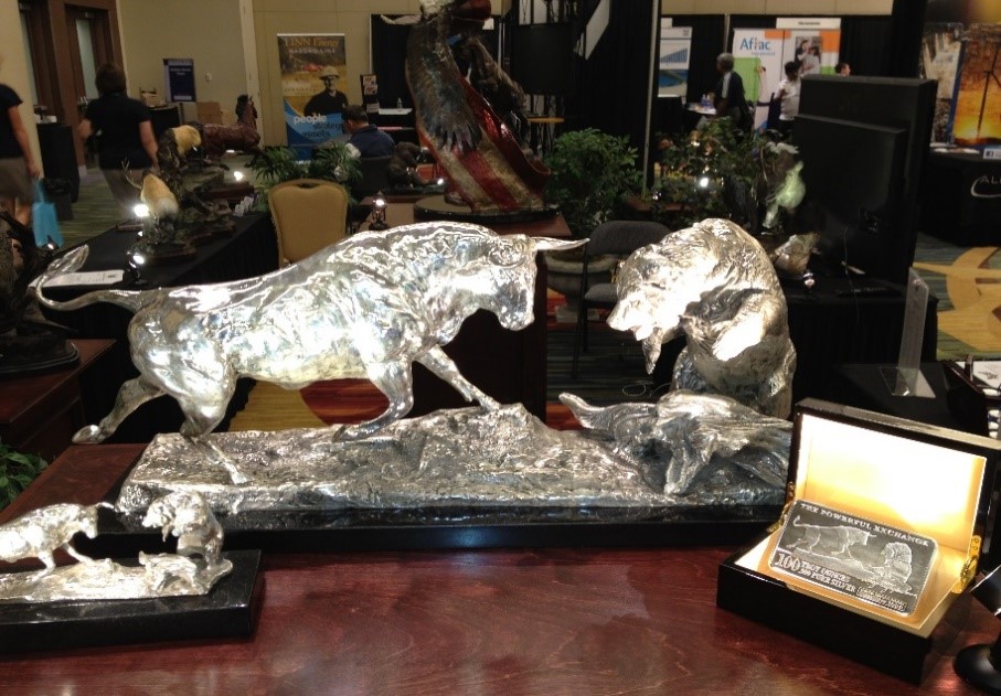 Russo, no stranger to selling pure silver sculptures, sold over 100,000 ounces of silver pieces in just a few years after attending a few select conferences including the San Francisco Hard Asset Investment Conference where in just a few hours sold 22 sculptures of a 1000 ounce .999 pure silver bull and bear piece by Lorenzo Ghiglieri. "When at the right venue, with the right product in a precious metal, especially in pure silver people really get excited. We sold over $1 million in silver sculptures in a few hours showing our new 1000 ounce bull and bear piece entitled the 'New Powerful Exchange,'" says Russo.