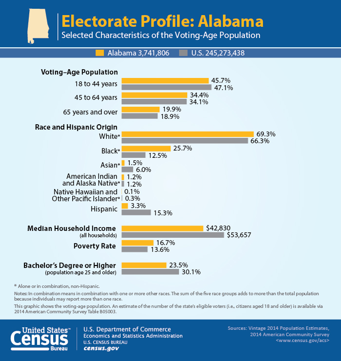 WASHINGTON, Feb. 23, 2016 /PRNewswire-USNewswire/ -- In advance of the Alabama primary on March 1, the U.S. Census Bureau presents a variety of statistics that give an overall profile of the state's voting-age population and industries. Statistics include: