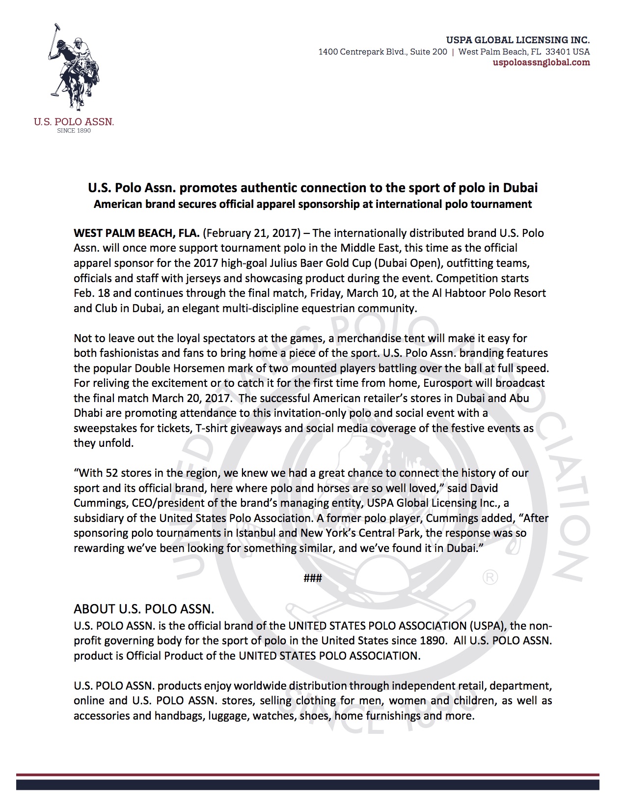 WEST PALM BEACH, Fla., March 2, 2017 /PRNewswire/ -- The internationally distributed brand U.S. Polo Assn. will once more support tournament polo in the Middle East, this time as the official apparel sponsor for the 2017 high-goal Julius Baer Gold Cup (Dubai Open), outfitting teams, officials and staff with jerseys and showcasing product during the event. Competition starts Feb. 18 and continues through the final match, Friday, March 10, at the Al Habtoor Polo Resort and Club in Dubai, an elegant multi-discipline equestrian community.