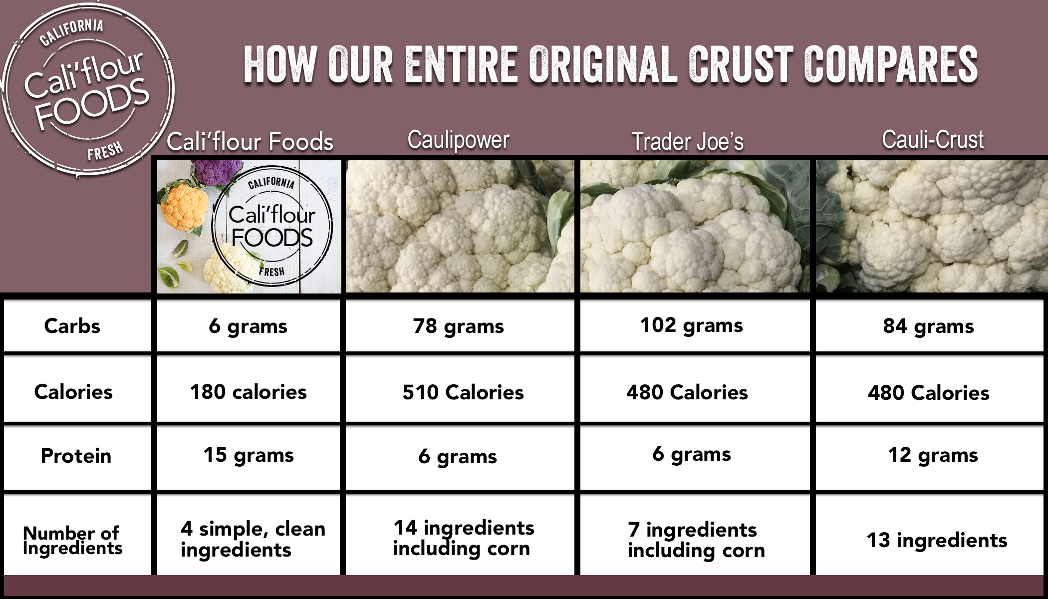 Compared to other similar cauliflower crusts, Cali'flour Foods crusts are significantly lower in carbs (6 grams) and calories (180), higher in protein (15 grams) and made with only four simple ingredients – cauliflower, fresh cheese, eggs and spices. Other brands on the market have anywhere from 78-102 grams of carbs and 480-510 calories. They also have significantly less protein at just 6 grams and are made with more ingredients, including corn.