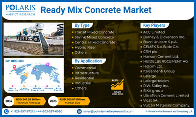 NEW YORK, Dec. 6, 2023 /PRNewswire/ -- A latest research report [110+] pages with 360-Degree visibility, titled "Ready-Mix Concrete Market Share, Size, Trends, Industry Analysis Report, By Type (Transit Mixed Concrete, Shrink Mixed Concrete, Central Mixed Concrete, Hybrid Riser, Others); By Application; By Region; Segment Forecast, 2023 - 2032" published by Polaris Market Research in its research repository.