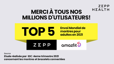 PARIS, France , 23 mars 2022 /PRNewswire/ -- Zepp Health (NYSE: ZEPP), leader mondial dans le domaine des objets connectés et de la santé, a terminé le dernier trimestre 2021 avec une croissance forte et régulière et a atteint le top cinq des exportations mondiales de montres pour adultes, selon de nouvelles données du Worldwide Quarterly Wearable Device Tracker de l'International Data Corporation (IDC).