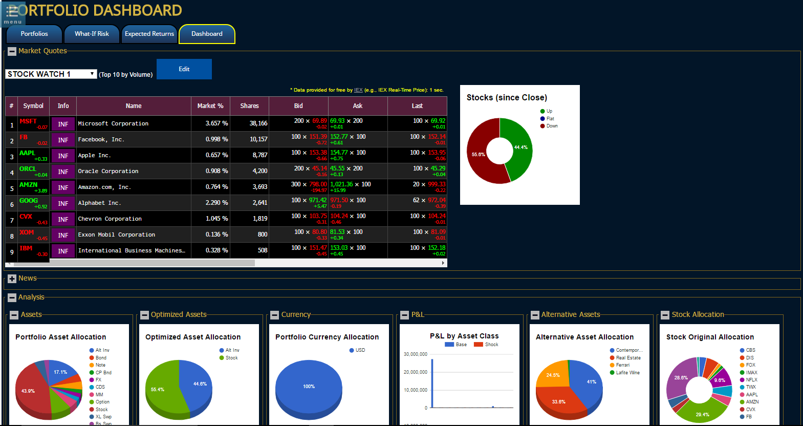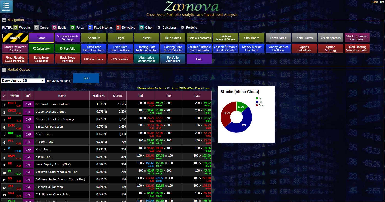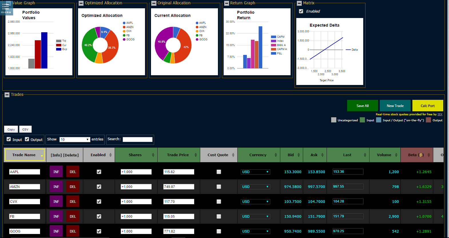 ZOONOVA® offers cutting-edge cross-asset portfolio and security pricing analytics for Stocks, Options, Bonds, FRN, Interest Rate Swaps, Credit Default Swaps, Alternative Investments and more. Now with the market data feed provided by the IEX API — which includes bids and asks quoted on IEX's order book, as well as data for trades on IEX — users have access to the data they need to calculate Portfolio Optimization, Efficient Frontier, CAPM Expected Return, Alpha, Beta, Delta, Sharpe Ratio, P&L, What-If Scenarios, and more in near real time.